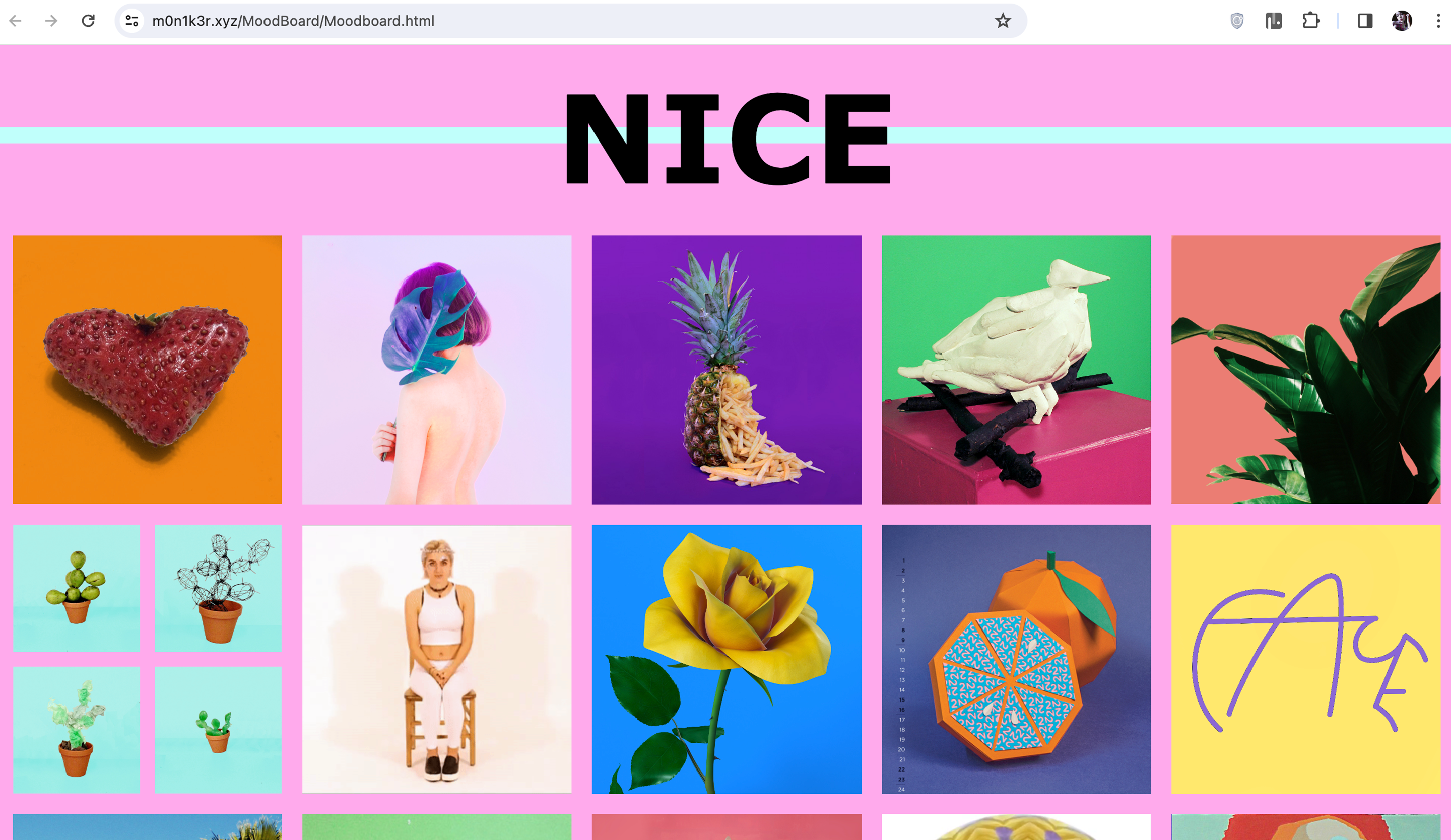 Website moodboard, includes art from artists I admire as well as some of my own work. HTML, CSS, Javascript.